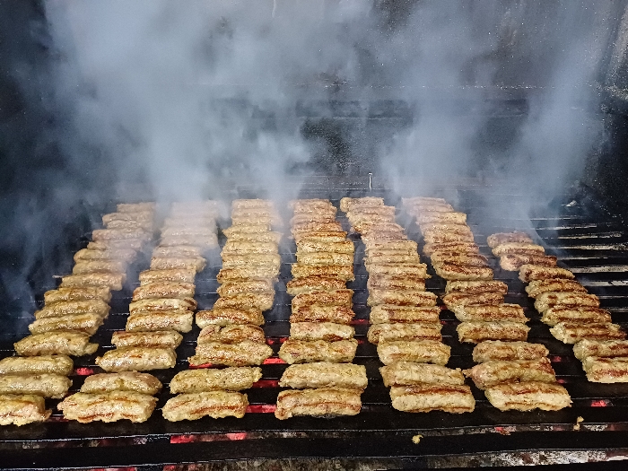 - "Numerous rows of elongated, light brown to reddish-brown grilled meat items, identified as cevapi, are captured cooking on a dark metal grill grate" by FM-hm5GO2, licensed under CC BY 4.0