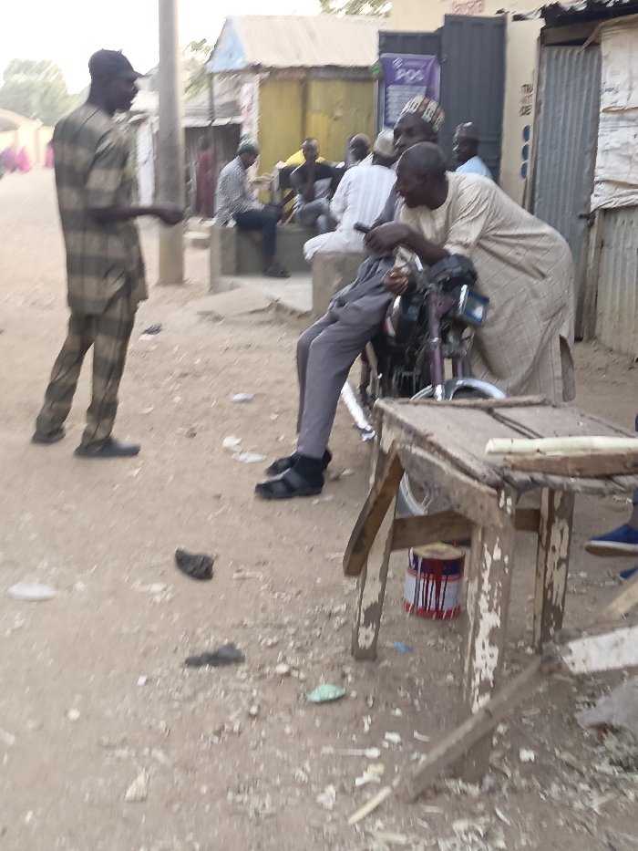 Several men stand outside a building on a sunny day. One man in a striped suit faces left while talking to another in an off-white gown who leans on a motorcycle. Other men are seated in the background. A weathered wooden table stands in the foreground, with a paint can underneath. The ground is sandy and littered with debris.