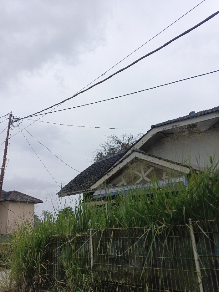 The image displays an outdoor scene in Bhimad, Nepal, under an overcast sky. In the foreground, tall green grass partially obscures a weathered, dark-colored metal mesh fence. Beyond the fence on the right, a residential building is partially visible, featuring a dark, pitched roof with visible weathering and light-colored eaves showing signs of paint deterioration. A decorative gable with an 'X' pattern is present below the roofline, above a partially visible blue-colored element. To the left, a wooden utility pole supports multiple dark electrical or communication wires, several of which traverse horizontally across the upper portion of the frame. In the left background, another residential structure with a similar dark, pitched roof and light brown walls is partially visible. No individuals or active interactions are present.