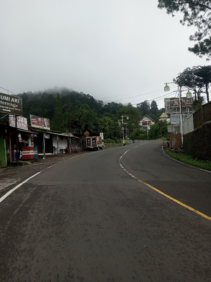 This image depicts a winding asphalt road through a mountainous, semi-urban landscape in what is described as the city of Bangtsho, Bhutan, under an overcast sky. The road, appearing damp, features a solid white line marking its left edge and a yellow line delineating the center for a gentle right curve. On the left side of the road, a series of low-rise commercial structures or stalls are present. A prominent sign above one reads "BUMI AKI Heritage" with the additional text "Autentik Jawa Barat." Below this, a red "BENSIN MINI" fuel dispenser is visible. Further along this side, a small white utility truck, possibly a mobile vendor, is parked off the road. The background on the left features densely forested mountains partially obscured by mist or low clouds. The right side of the road is bordered by a stone retaining wall, partially covered with greenery. Further up, a large, billboard-like sign structure, possibly related to "BUMI AKI," stands alongside the road, accompanied by poles from which decorative, lantern-like objects are suspended. Beyond the wall and sign, several distinct houses with light-colored facades and dark roofs are visible amidst trees, one featuring a small dome or turret. A single motorcycle is seen traveling uphill on the road in the distance. Overhanging pine branches are visible in the upper right corner of the frame. No pedestrians are discernibly present.