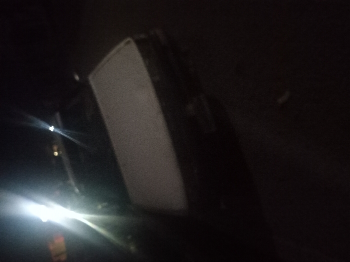 An upside-down view shows the top of a vehicle. The vehicle's white roof contrasts sharply with the surrounding darkness. Headlights are visible on the left side, casting a bright glare into the frame. The overall scene is dark and blurry, hindering a clear view of the vehicle's features and surroundings. It is difficult to see anything outside the vehicle due to the extreme darkness.