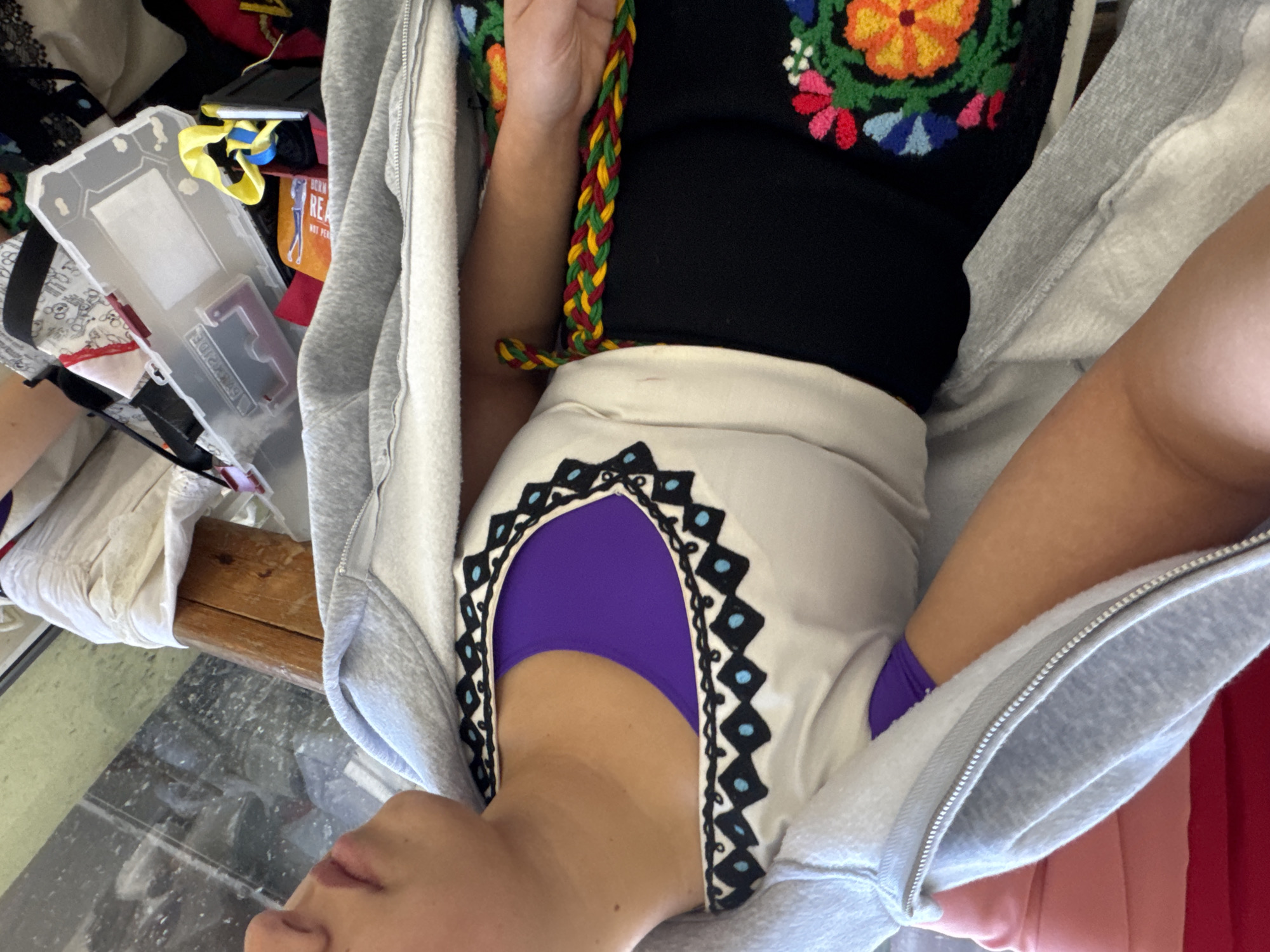 - "A person wearing a gray zip-up hoodie over clothing with embroidered floral patterns and a white garment with geometric trim is visible" by FM-6DJyS2, licensed under CC BY 4.0
