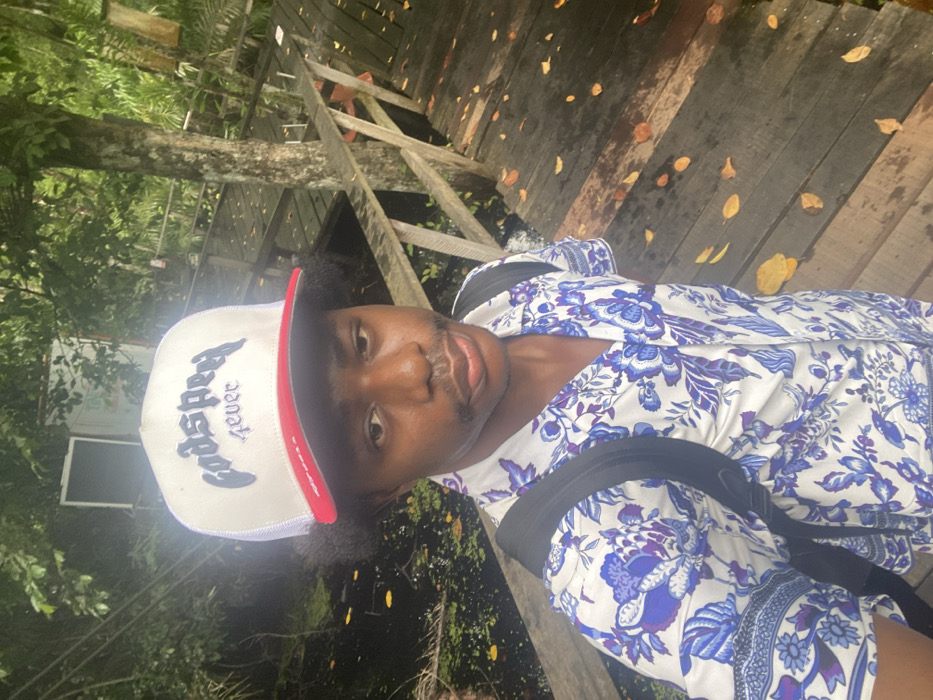 A young adult male of dark complexion is depicted in a selfie, looking directly at the camera with a neutral expression. He is wearing a white short-sleeved collared shirt with a blue floral pattern, a black backpack, and a white trucker hat featuring a red brim and the word "Godspeed" embroidered in dark blue. He has short, dark, curly hair visible at the sides and a slight mustache and chin hair. The subject stands on a dark wooden boardwalk, which is scattered with yellow leaves and extends into the background on the right. To the left of the boardwalk is dark, still water containing green aquatic vegetation and a few yellow floating leaves, indicative of a swampy or marshland environment. Dense green foliage and trees form the background and surround the scene. A tree trunk is visible near the boardwalk on the right. In the far background, partially obscured by the foliage, a small, light-colored structure with a dark rectangular opening is present. The specific city of Ojomu, Nigeria, is not discernibly identifiable from the visual content of the image, but the environment is consistent with a natural preserve or forested area with a wetland component.