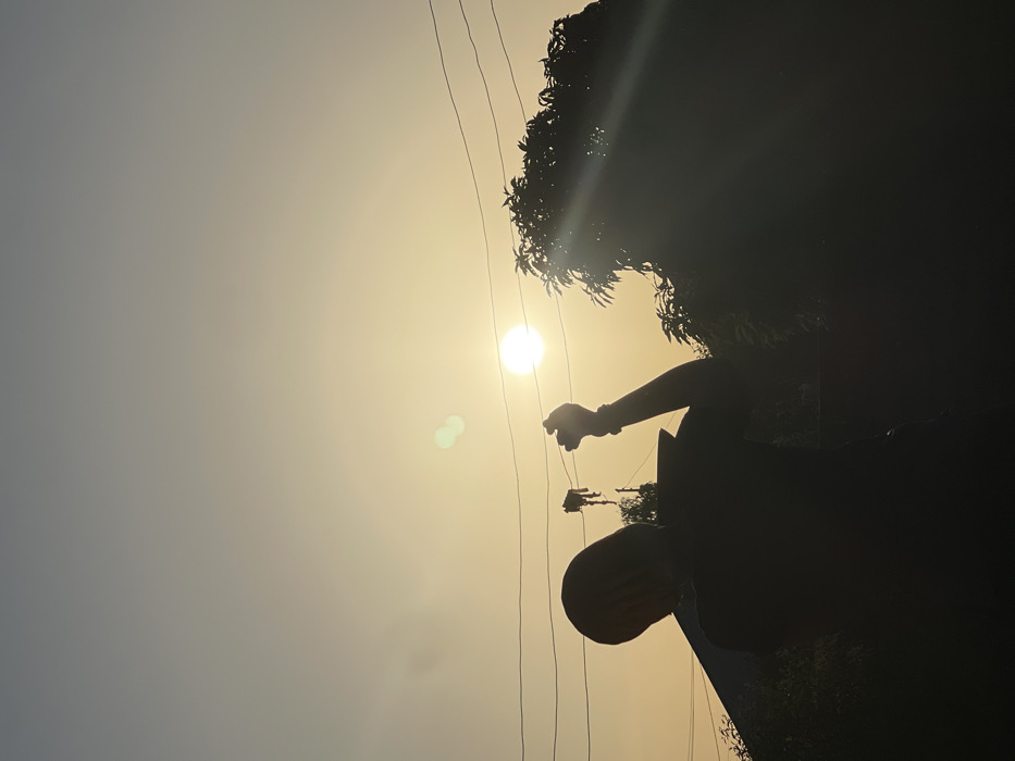 The scene is set in Jos, Nigeria, during either sunrise or sunset, characterized by strong backlighting that creates deep silhouettes. The sky exhibits a gradient of warm yellow and orange, with the sun appearing as a bright, circular light source positioned slightly right of the frame's horizontal center. A solitary, heavily silhouetted individual is visible in the lower-left to central portion of the frame, facing away from the camera. Their right arm is raised, and they are holding a small, unidentifiable object at approximately eye level, directed towards the sun. Several dark utility wires traverse horizontally across the mid-upper section of the frame, with an irregular dark object hanging from one wire on the left. A dense, dark mass of foliage, likely a tree, is silhouetted along the right edge, while the dark outline of a building's roof is partially visible on the far left.
