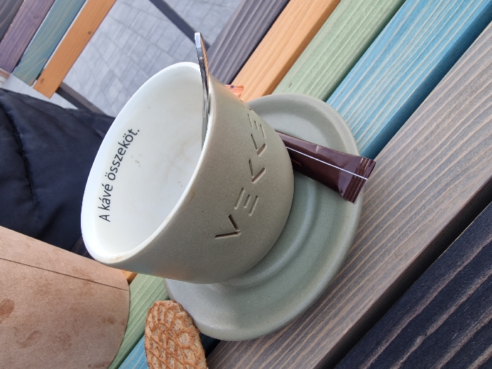 The scene depicts an outdoor setting in Odorheiu Secuiesc, Romania. A largely empty, light green ceramic coffee cup rests on a matching saucer on a multi-colored wooden slatted surface, likely a table or bench. The cup's exterior features the embossed word "VEKKE." Its off-white interior displays the black text "A kávé összeköt." (Hungarian for "Coffee connects.") and shows traces of a light brown liquid residue. A silver metal spoon is positioned inside the cup. On the saucer, a brown, rectangular sugar packet is present. To the left of the cup, a textured, round, light brown cookie or biscuit lies on the wooden surface. In the upper left quadrant, a portion of a tall, light brown disposable paper cup with visible stains is present. Behind these items, a dark, textured fabric surface, consistent with an article of clothing, is partially visible. In the upper right quadrant, a section of a multi-colored wooden chair back is visible, featuring slats in similar shades to the table. The wooden surface is composed of planks painted in various hues including black, dark grey, light grey, blue, green, and brown.