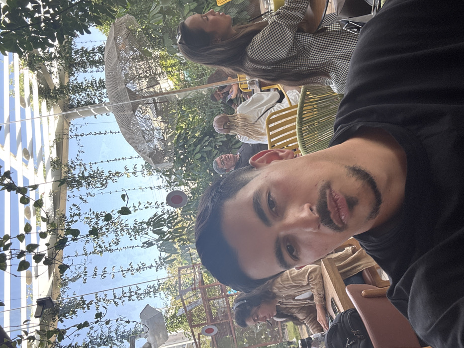 The scene depicts an outdoor cafe or restaurant patio, identified as located in Rishon LeZion, Israel, under clear daylight conditions. In the immediate foreground, a male, approximately 20-35 years old, with dark hair, a mustache, and a goatee, is positioned slightly left of center, looking directly into the camera. He wears a black long-sleeved garment. Behind the foreground subject, to the left, a woman with dark hair and headphones is seated at a light-colored wooden table. She wears a light brown, long-sleeved top and appears to be interacting with a laptop or similar device on the table. A black backpack and a dark water bottle are also present on her table. Further into the midground, several other individuals are seated. An older male with eyeglasses and short dark hair is visible, looking towards his left. A female with long blonde hair, wearing a white top and a light-colored baseball cap, is seated with her back partially to the camera on a yellow chair. To the right, another female with long dark hair, wearing a black and white checkered shirt, is seated at a round wooden table, also with her back partially to the camera. A glass containing a light-colored beverage is on her table, and she wears sunglasses on her head. The environment features an overhead white slatted pergola structure from which numerous green vines and foliage hang downwards, creating a natural canopy. The clear blue sky is visible through the pergola slats. A large, decorative, light-colored woven umbrella or parasol is suspended in the background, right of center. Additional green foliage and trees are visible beyond the seating area. In the far left background, abstract metallic structures and two circular red-and-white target-like decorations are discernible.