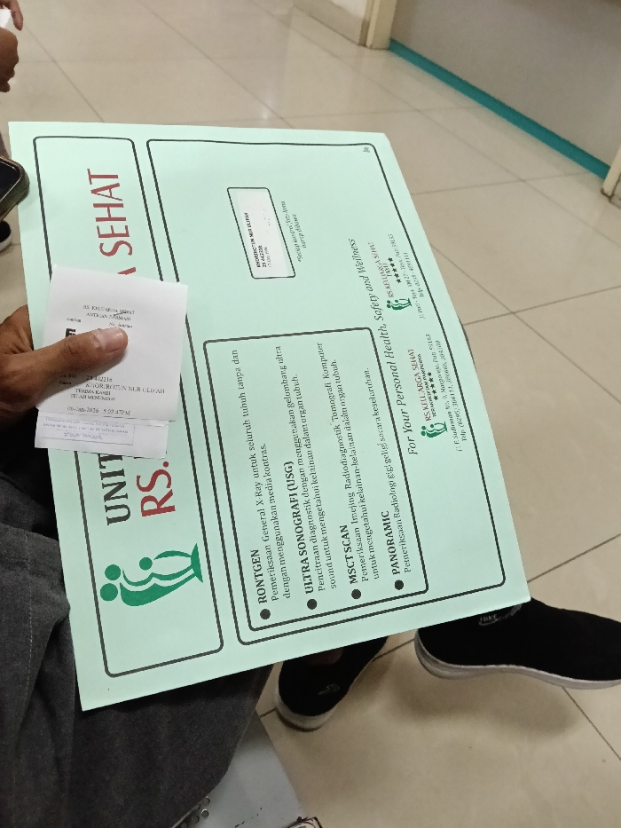 An individual is seated in an indoor waiting area of a medical facility, identified as RS Keluarga Sehat (Family Healthy Hospital) located at Jl