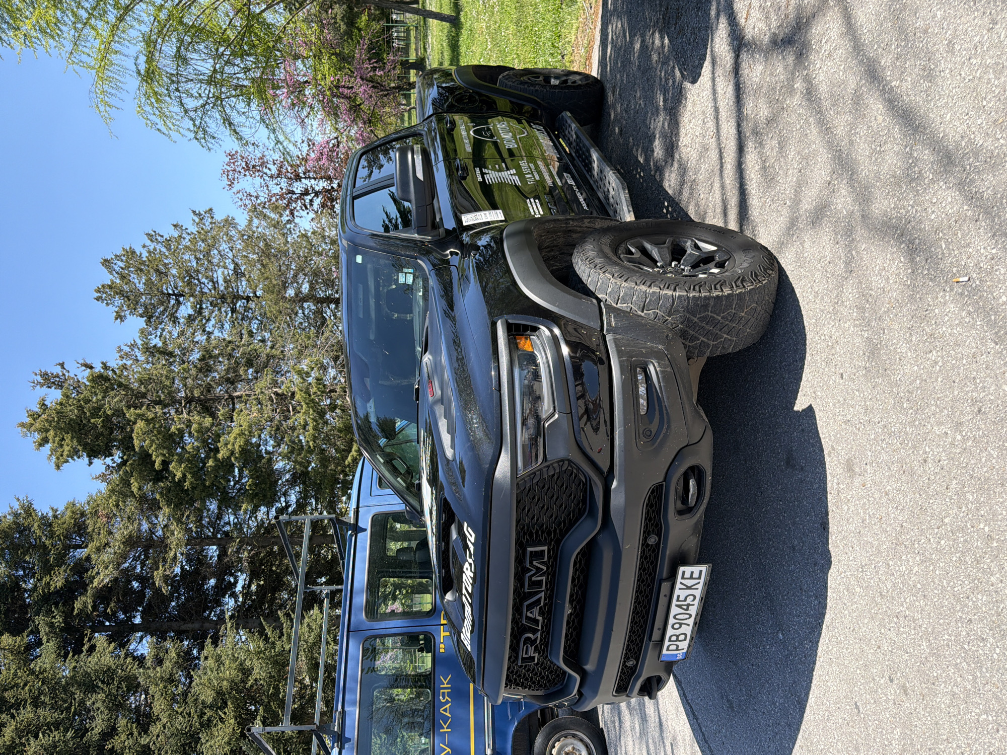 The image captures a black RAM pickup truck parked on an asphalt surface, likely a road or parking area. The front of the truck is prominently displayed, revealing a Bulgarian license plate that reads "PB 9045 KE". Adjacent to the truck is a blue van with a ladder rack on its roof. The van is partially obscured behind the pickup. Text on the blue van reads "У-КАЯК" and "BromATORSAG". Visible on the side of the truck, the text reads, "CASTING FILM SERIES BIDMOTORS PRODUCED BY: BUST". A line of trees are behind the truck and the van. The scene appears to be in an urban environment, given the road and presence of vehicles. Based on the license plate prefix "PB", the city is Plovdiv, Bulgaria. The weather seems clear and sunny.