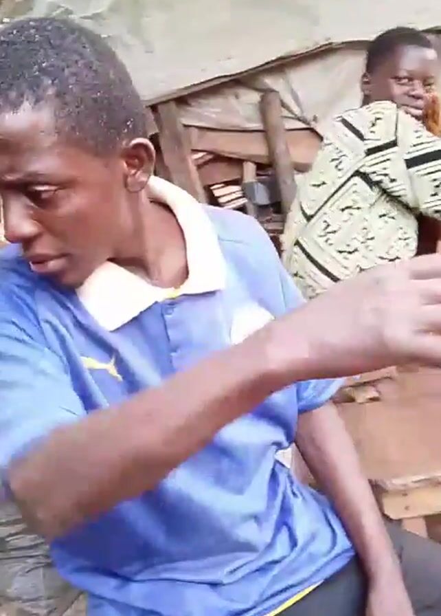 A man wearing a blue shirt with a white collar and a Puma logo sits on what appears to be a low platform of bricks. He looks down and then up at the camera. He is surrounded by wooden planks, cardboard boxes, and plastic sheeting, suggesting an area under construction or a makeshift shelter. Another person is partially visible in the background.