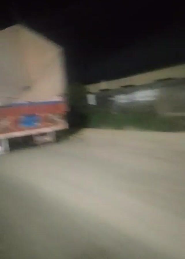 A blurry video shows a vehicle passing on a road at night. The vehicle appears to be a large truck, possibly a tanker. The road is dark and the surrounding area is barely visible, but there seem to be houses along the road. The quality of the video is poor, and there is a lot of motion blur.