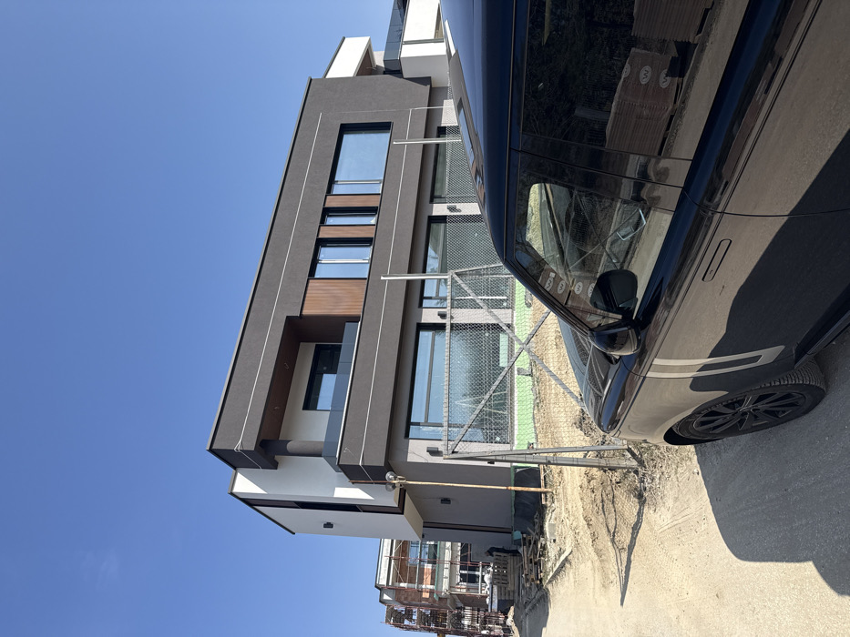 The image captures a modern residential construction scene in Pleven, Bulgaria, under a clear daytime sky