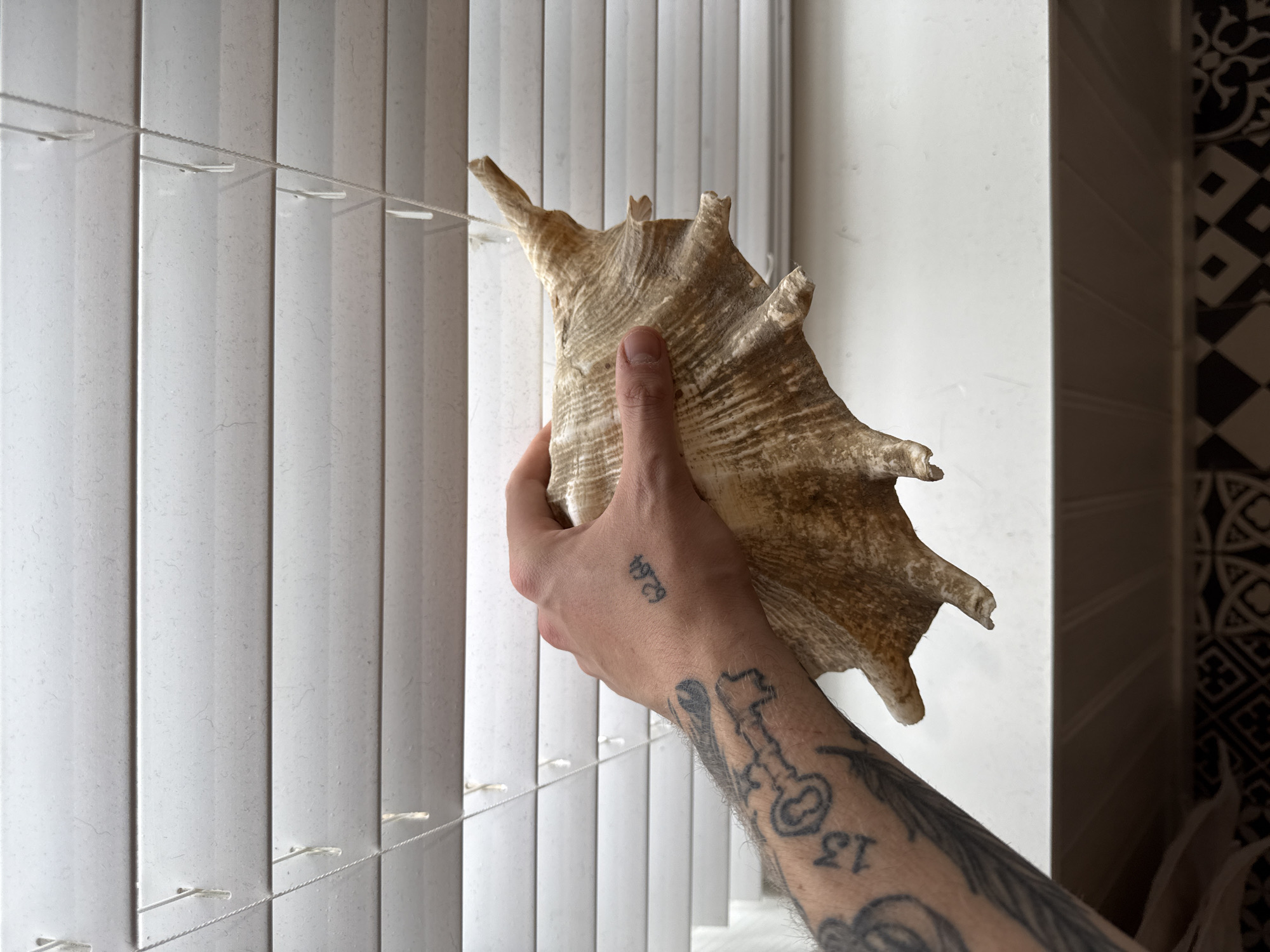 A person's forearm and hand are holding a large conch shell in front of a window with vertical blinds. The arm has multiple tattoos including a key and the number "13". The hand has a tattoo that reads "62.64". The background includes white blinds and a wall with a black and white patterned tile design on the right side. The photo was taken indoors with natural light. There is no indication of this photo being taken in Hitchin, United Kingdom.