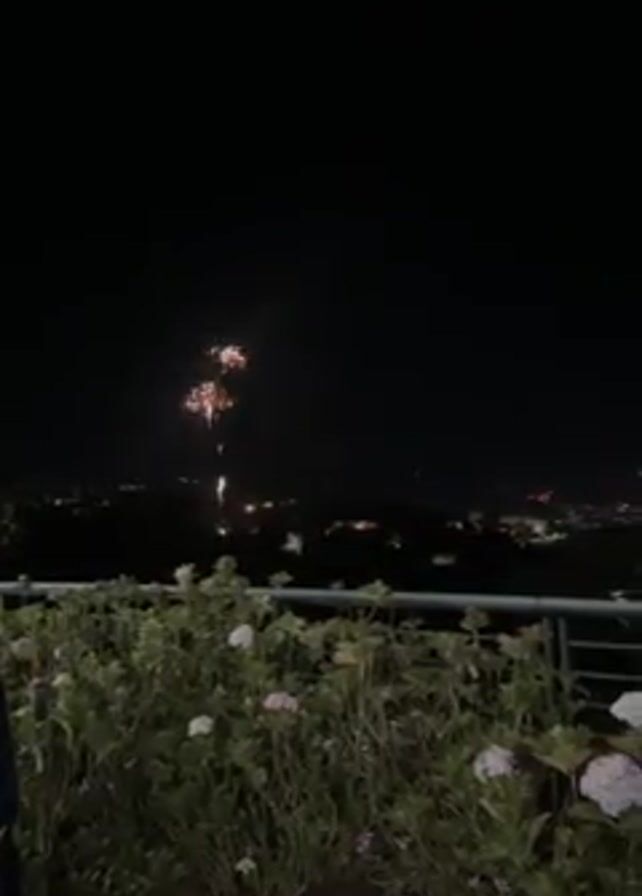 A night-time outdoor scene showing a display of fireworks. The camera is positioned behind a metal railing with flowering bushes in the foreground. Beyond the railing is a view of a city on a hill. The fireworks are exploding in the night sky above the city. A person wearing a dark suit is partially visible on the left of the screen.