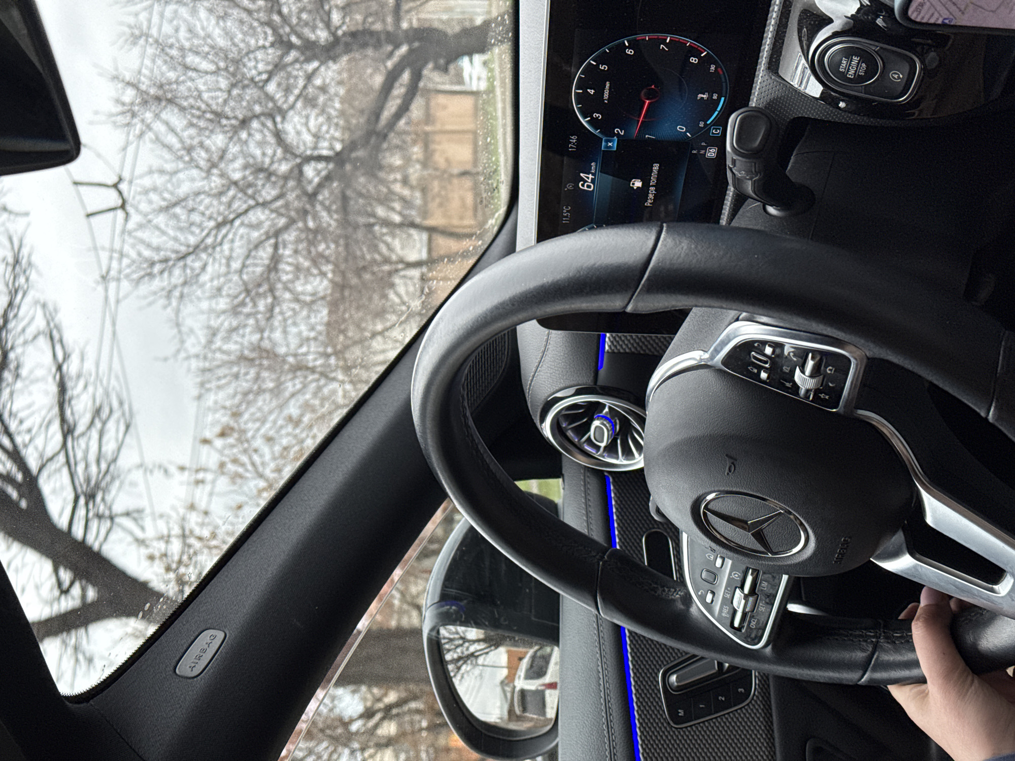 interior of a car, specifically the driver's perspective, likely taken while the car is in motion. The dashboard reveals a digital speedometer reading 64 km/h and a tachometer showing the engine running slightly above idle. The car is a Mercedes-Benz, as indicated by the logo on the steering wheel. An "AIRBAG" label is visible on the driver's side A-pillar. Outside the car's window, bare trees suggest a season with little or no foliage. The location is not specified in the image, and it's not possible to confirm Yerevan, Armenia.
