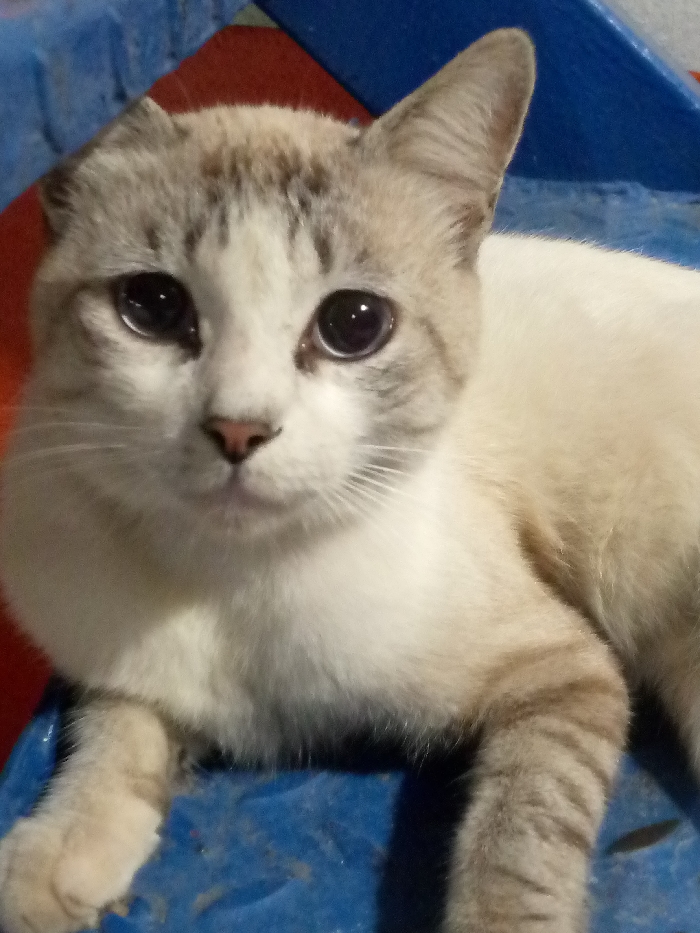 - "A cat with cream and light grey tabby point coloration is observed in a close-up, lying on a textured blue surface" by FM-Q5qB73, licensed under CC BY 4.0