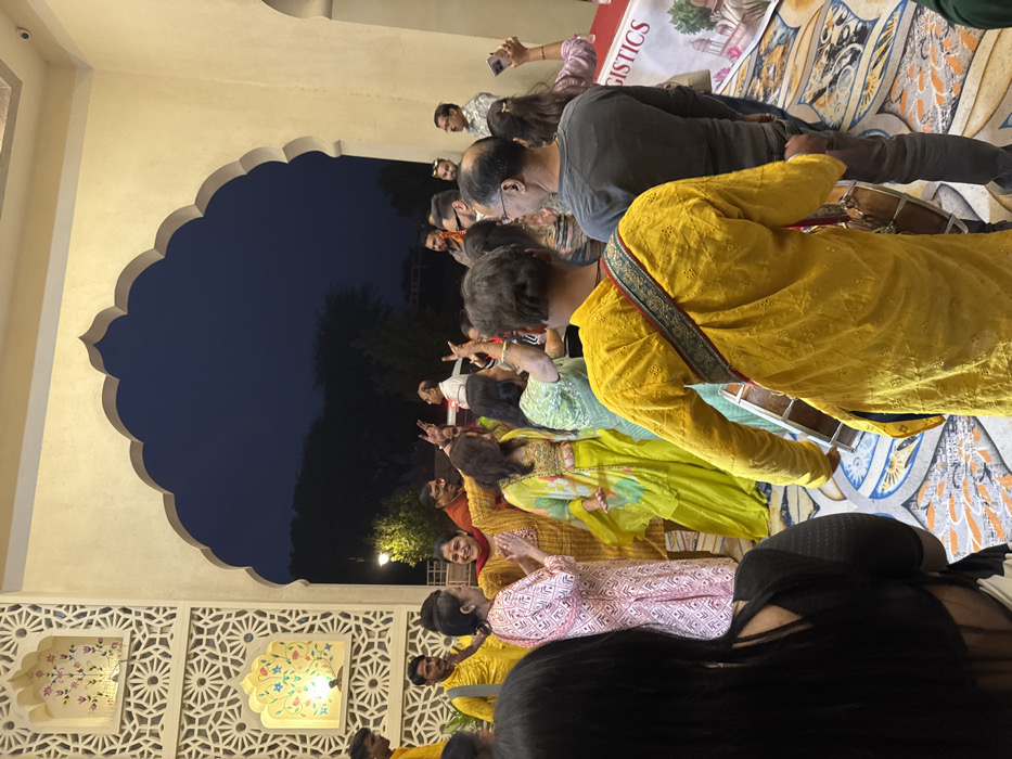 The image depicts a social event taking place within an elaborately decorated architectural structure in Malasar, India, during the evening