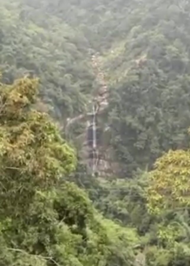 waterfall cascading down a cliff face. The waterfall is surrounded by dense green foliage. The water flows down the cliff in several distinct sections, creating a tiered effect. The cliff face is made up of dark-colored rock. The trees in the foreground are lush and green. The sky is overcast, and the overall atmosphere is misty.