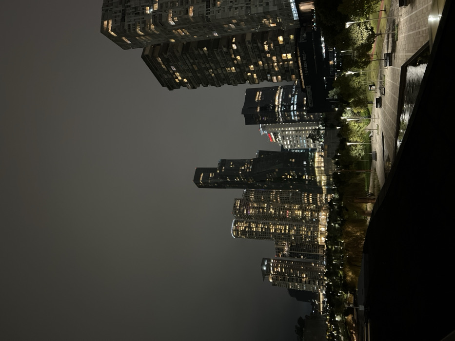 nighttime cityscape. Several illuminated skyscrapers rise into a dim, grey sky. A park area with walkways and trees stretches alongside some of the buildings. A dark, curved object, possibly a ledge or railing, dominates the right side of the frame. Lights from the buildings reflect off an unseen body of water.