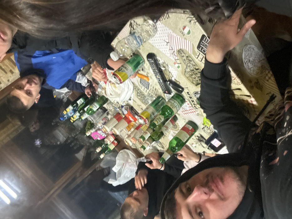 The image depicts an indoor social gathering around a table, indicating a location within Bulgaria, consistent with Dobrich, due to the presence of Bulgarian product labels. At least four individuals are visible. In the foreground, a male with a mustache and dark hooded sweatshirt looks directly at the camera. To his left, another male with short dark hair is partially visible, reaching towards his mouth. To the right, a third male with short dark hair, wearing a blue and black jacket, gazes towards the left of the frame. The back of a fourth person's head and shoulder are visible on the far right. The central table is covered with a multi-patterned tablecloth featuring Italian-themed designs. Numerous objects are scattered across the table: at least ten green glass beer bottles, several beer cans (including "Пиринско"), a plastic water bottle (labeled "БАНКЯ"), smaller beverage bottles, two white plastic bags, a black television remote control, an orange utility knife, and assorted snack wrappers. Overhead artificial lighting is reflected in a large, dark, reflective surface or window in the background, which also shows faint reflections of additional individuals. The environment is casual and enclosed.