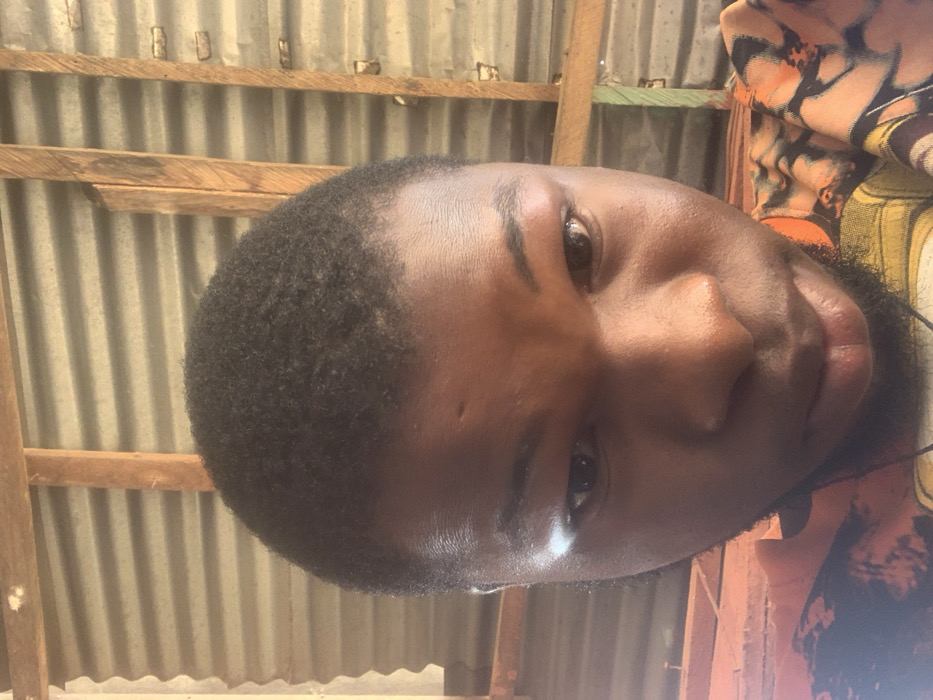 The image presents a close-up, front-facing portrait of a dark-skinned individual with short, kinky black hair
