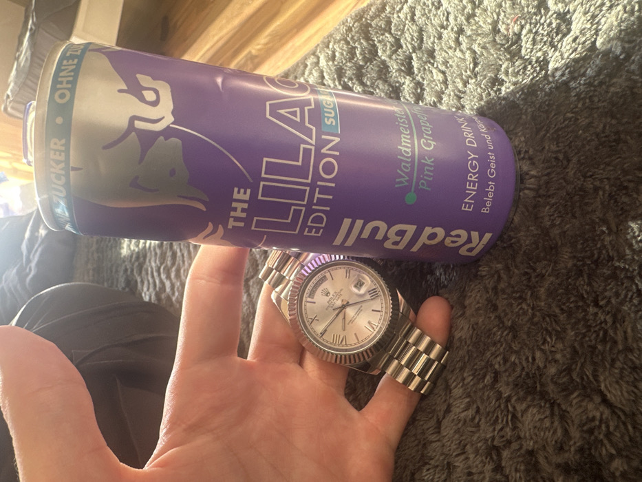 - "The scene, located in Höri, Switzerland, depicts a close-up indoor shot centered on a human hand, a wristwatch, and an energy drink can, resting on a dark grey, shaggy rug" by FM-bhobG2, licensed under CC BY 4.0