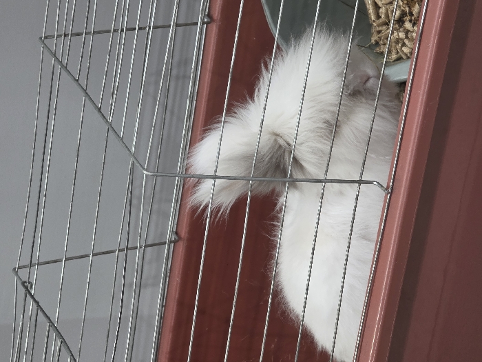 - "An indoor scene in Yagodovo, Bulgaria, features a white, long-haired rabbit situated within a pet cage" by FM-SXaEj1, licensed under CC BY 4.0