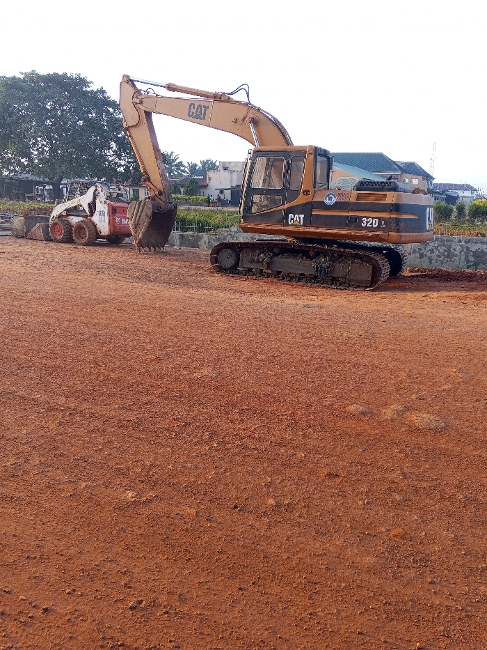 The image displays an outdoor scene in Yelwa, Nigeria, featuring two pieces of heavy machinery on an expansive area of reddish-brown, dry earth. In the midground-right, a yellow and black Caterpillar 320L tracked excavator is stationary. Its boom is articulated upwards, and the bucket is lowered near the ground; both the tracks and bucket show visible accumulation of soil. The "CAT" logo is prominently displayed on the boom, cabin, and engine compartment, alongside the model number "320 L." In the background-left, a smaller, white and red Bobcat skid-steer loader is also stationary, with its bucket positioned near the ground. A low, grey concrete barrier runs horizontally across the midground, separating the immediate construction area from the background. Beyond this barrier, several buildings with pitched roofs are visible, including one with a green roof. Lush green trees and other vegetation are present in the far background, and a tall, slender pole is discernible on the right. The sky is bright and clear. No individuals are visible in the scene, and no specific actions or interactions between subjects are depicted beyond their static placement.