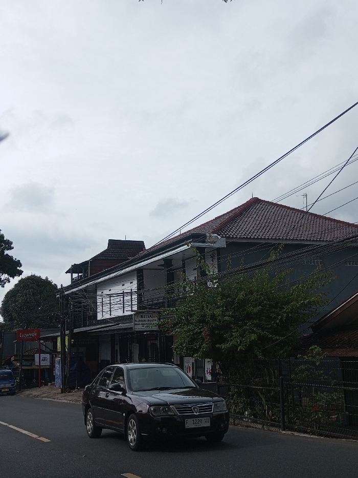 A dark brown Proton Waja car is on a paved road. Buildings line the street, with one building having a red-tiled roof. A tree partially obscures a fenced area. Signs hang on some of the buildings. Power lines traverse above the structures. The sky is overcast. A blue vehicle is visible in the background.