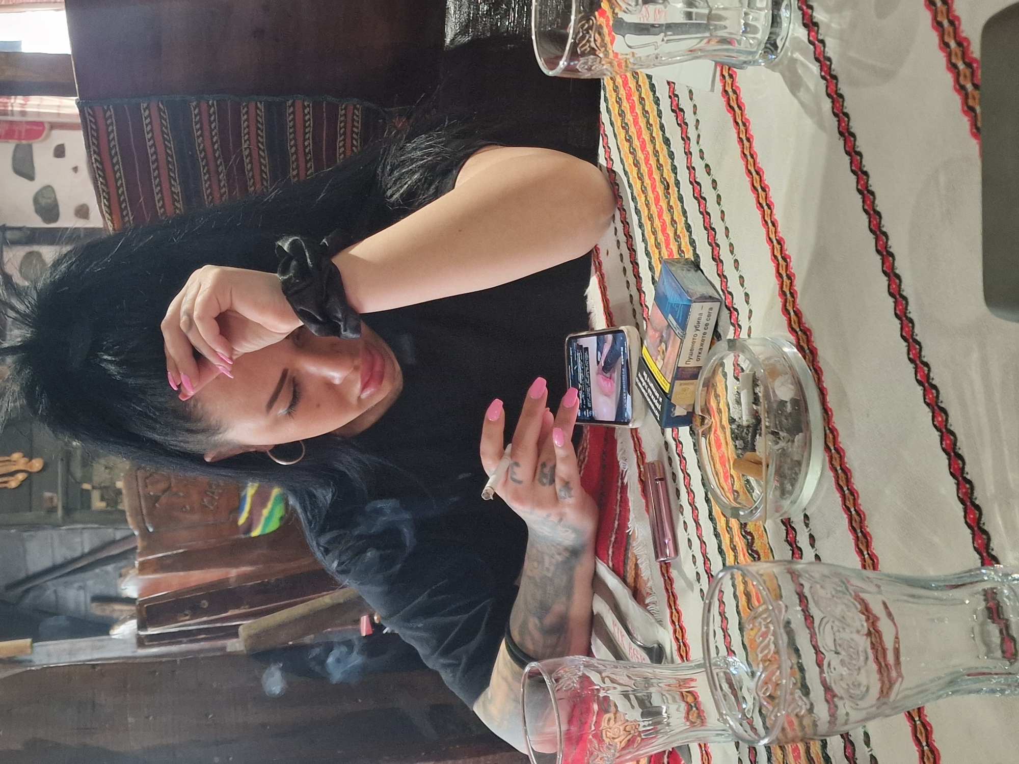 A woman with black hair and pink fingernails is seated at a table in what appears to be a restaurant or cafe, possibly located in Plovdiv, Bulgaria given the context. She is holding a cigarette in one hand and looking at her phone with the other. The table is covered with a patterned cloth and has an ashtray with cigarette butts, a pack of cigarettes, a lighter, and two empty Coca-Cola branded glasses. The background is somewhat blurred, showing wooden furniture and decorative elements.