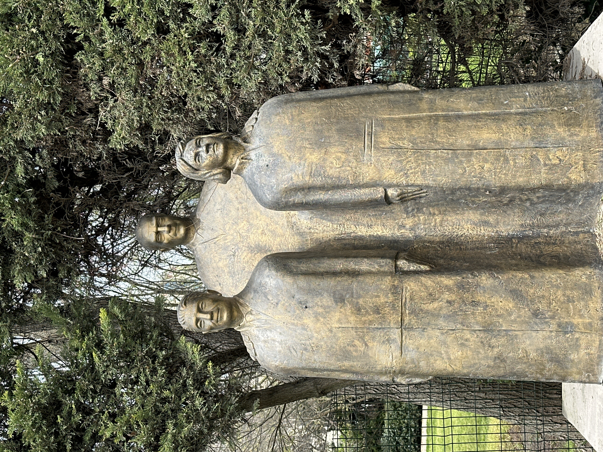 bronze sculpture of three figures standing together, set against a backdrop of green foliage and trees