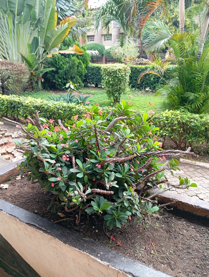 This image depicts a well-maintained garden scene within the city of Onitsha, Nigeria. In the foreground, a raised concrete planter with a dark top edge contains dark soil and a prominent *Euphorbia milii* (Crown of Thorns) shrub. The shrub features multiple thorny stems, dark green oval leaves, and numerous small pink to red flowers, with several fallen petals on the soil. Directly behind the planter, an interlocking paver pathway is visible. The midground consists of a manicured lawn bordered by various sculpted hedges and evergreen shrubs, including a distinct columnar topiary. The background presents lush tropical foliage, notably the large, fan-shaped leaves of a Traveler's Palm and other palm species. A light-colored, multi-story building with several grid-patterned windows is partially visible in the far background, surrounded by vegetation. No individuals are present, and no specific actions or interactions are depicted.