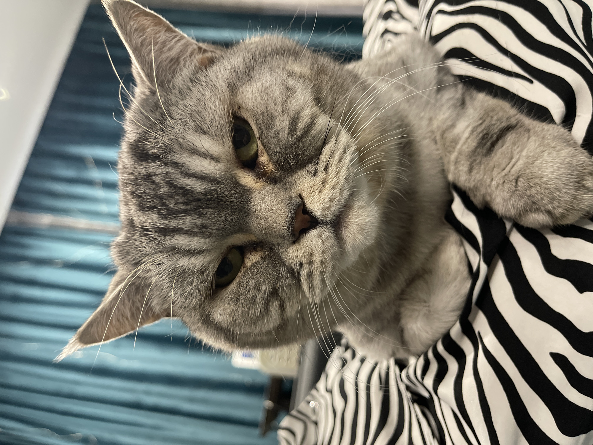 The image displays a close-up, frontal view of a domestic cat. The cat possesses grey fur with darker grey tabby stripes, prominent cheeks, and partially narrowed, amber-green eyes, conveying a seemingly stern or weary expression. Its nose is pinkish, and long white whiskers extend from its muzzle. The cat's front paws are tucked or crossed, resting on a surface covered by a fabric featuring a distinct black and white zebra print pattern. In the blurred background, out-of-focus teal or dark blue pleated curtains are visible to the left. To the right, indistinct household objects are present, including a light-colored bottle or container and a dark, unidentifiable item. The scene is indoors, likely within a residential setting. The image contains no visual indicators to determine its specific location within the city of Chaikovsky, Russia. There are no human subjects or direct interactions depicted.