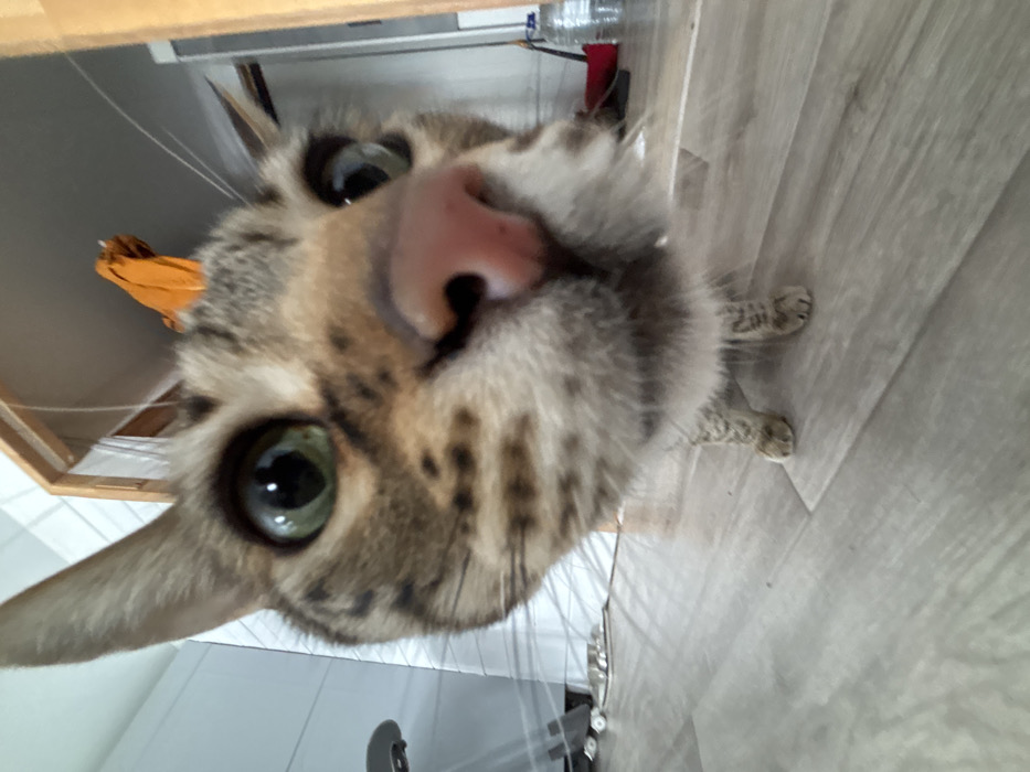 The image depicts an extreme close-up, wide-angle perspective of a domestic cat standing indoors in the city of Unknown, Unknown. The cat, characterized by brown and black spotted/striped fur, prominent round green eyes, and a pink nose, has its face dominating the frame, with its snout and nose positioned directly towards the camera, suggesting an act of close inspection. Only the cat's front paws are clearly visible, resting on a light grey wood-grain laminate floor. The background to the left shows a portion of a white structure, possibly a cabinet or wall, with a metallic object and white cables on the floor. To the right, a doorway with a light-colored frame is partially visible, with a plastic water bottle and a red object on the floor near the wall. An orange fabric or object is discernible above the cat's head, possibly hanging from a door frame. The scene is illuminated by ambient indoor lighting.