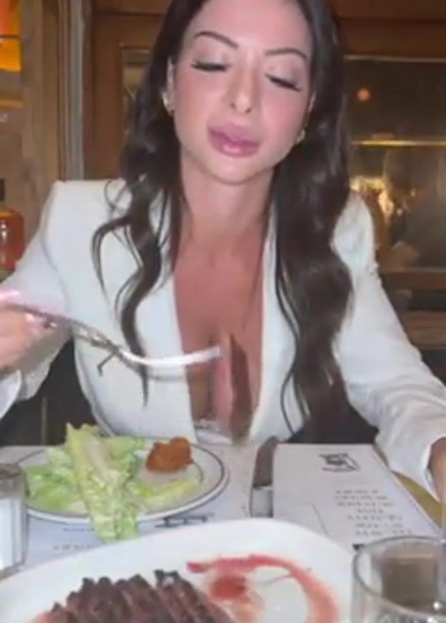 A woman is seated at a table in what appears to be a restaurant. She has long, dark, wavy hair and is wearing a white blazer. She has fair skin and is wearing makeup. In front of her are two plates of food: one with a sliced steak and the other with a salad. She picks up a piece of steak with her fork and eats it. There is a salt shaker and a glass of water on the table as well as a menu. The background shows wooden paneling and a dimly lit interior with other people present.