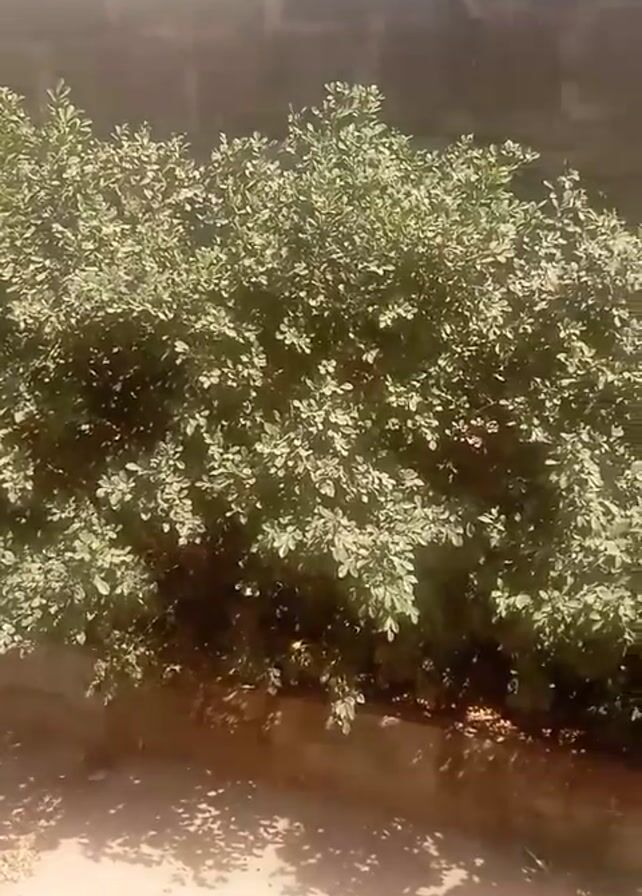 bush with green leaves along a wall. The wall is made of stone, and the bush is trimmed. There is a sidewalk in front of the bush, and the sun is shining, creating shadows on the ground.