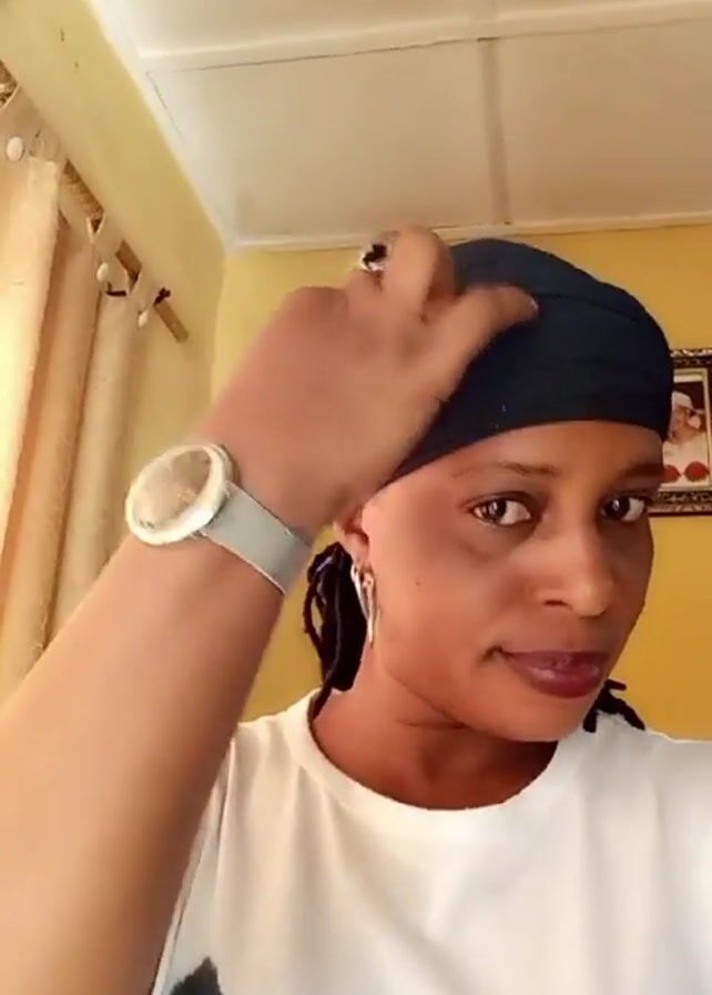 A medium close-up shot shows a woman wearing a black head covering, a white t-shirt with a black design, and silver jewelry, including a watch, ring, and earrings. She is holding the top of her head covering with her hand. The background consists of a yellow wall with a framed picture, white ceiling panels, and a window with a tan curtain. The woman is looking directly at the camera.
