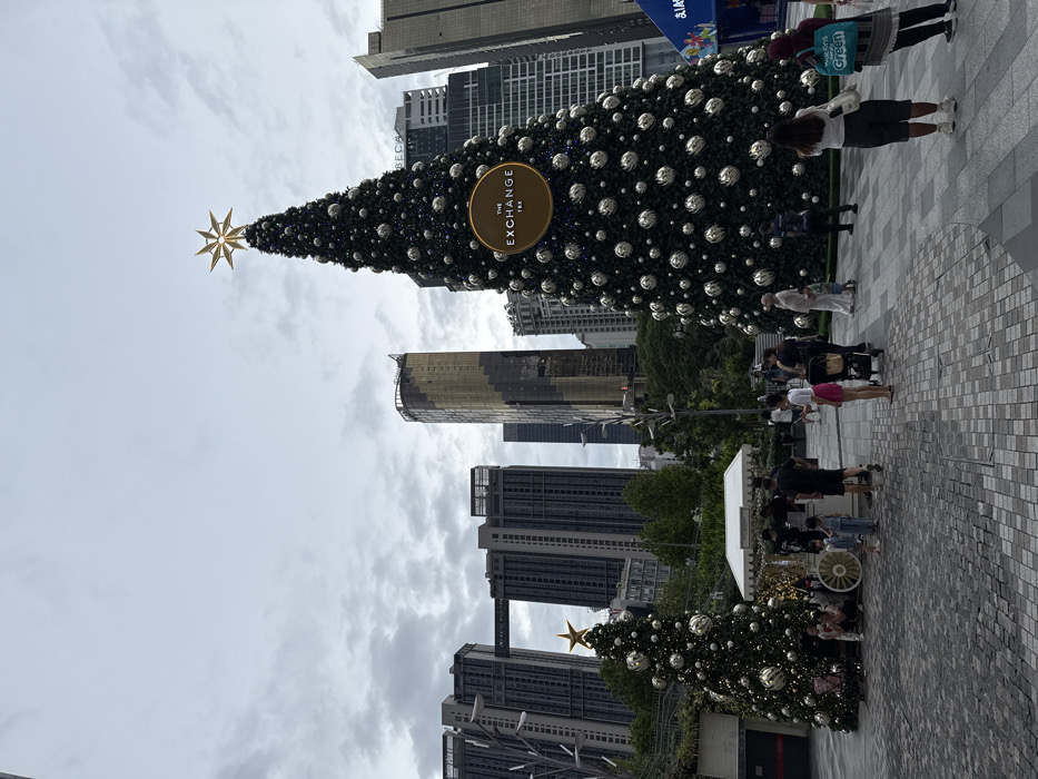 The image depicts an outdoor urban plaza at The Exchange TRX in Kuala Lumpur, Malaysia, under an overcast sky. The focal point is a large, tall Christmas tree on the right, adorned with numerous silver spherical ornaments and a golden star topper, bearing a circular "THE EXCHANGE TRX" sign on its lower section. To the left, a smaller, similarly decorated Christmas tree is visible. The ground is paved with patterned light and dark grey tiles. In the background, multiple modern high-rise buildings rise under the cloudy sky, including two dark grey residential towers connected by a skybridge structure, and a distinctive golden-hued cylindrical skyscraper. Approximately 15-20 individuals, including adults and children, are scattered across the plaza; some are walking, others standing and observing the festive environment. A white canopy stall with a wooden cart is positioned near the smaller Christmas tree, around which a small group of people, including children, are gathered. A woman on the far right holds a green "Watsons" branded bag.
