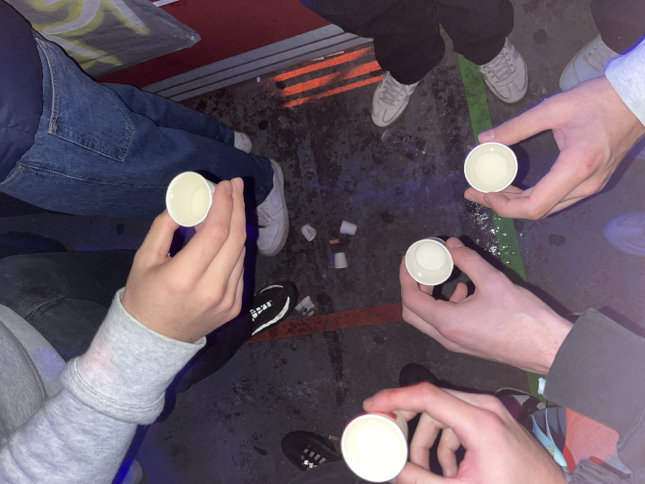 The scene depicts an indoor gathering in Bragança, Portugal, under low, artificial lighting with blue and purple hues. The environment features a dark, possibly concrete or asphalt floor with scattered debris including several discarded small white paper cups and a small, dark glass bottle lying on its side. Red and green lines are painted or taped onto the floor, and a red wall with faded yellow graffiti is visible on the right. At least four individuals are partially visible from the waist down and above, primarily focusing on their hands and feet. Each of four distinct hands holds a small, white, disposable paper cup containing a light-colored opaque liquid. One individual wears a grey hooded sweatshirt, dark jeans, and black sneakers with white soles. Another wears blue denim jeans and white sneakers. A third person is in dark trousers and light-colored sneakers, while a fourth person's lower body is obscured but also wears light sneakers. The individuals are positioned in a casual, standing or semi-standing interaction around the floor area where the discarded items are present, indicating a social gathering involving beverages.