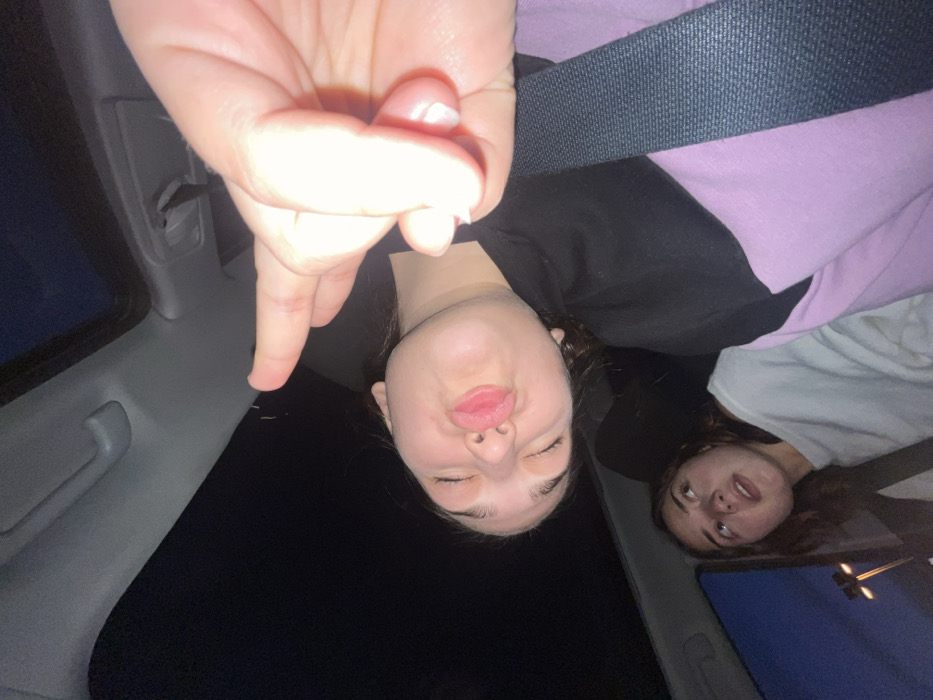 This image depicts two female individuals inside a vehicle at night, located in Vendenheim, France. The subject in the foreground, positioned to the right, has dark hair, a light complexion, and wears a black top over a light purple garment, secured by a dark seatbelt across her chest. Her eyes are closed, and her lips are pursed in a 'pout' or 'kissing' expression. Her right hand is raised to the upper right, forming a 'V-sign' with her index and middle fingers extended. In the background to the left, a second female subject with brown hair and a light-colored top is visible, looking upwards with a slightly open mouth and an expression of mild curiosity. The vehicle's grey interior ceiling and a sunroof are visible above the subjects, and the dark exterior through the windows confirms a nighttime setting, with faint distant lights visible on the far left.