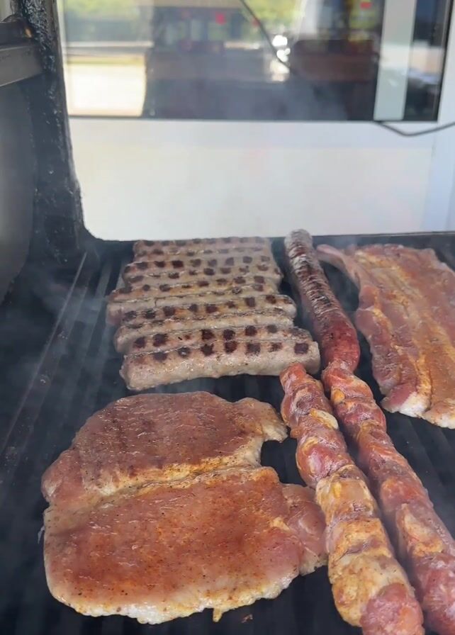 On a grill, several types of meats are cooking. Starting from the left, there are two large pork chops, followed by some cevapi, a sausage, two skewers of bacon wrapped in meat, and two strips of bacon. The grill is hot and smoky, and the meat is sizzling. The grill is situated in an outdoor kiosk type of restaurant. In the background, through the window, there's a glimpse of the interior of the restaurant, showing the counter, some shelves, and what appears to be a drink dispenser. A fan is also visible in the background. There is text in Cyrillic, ГЪЛЪБЕЦ, on the window.