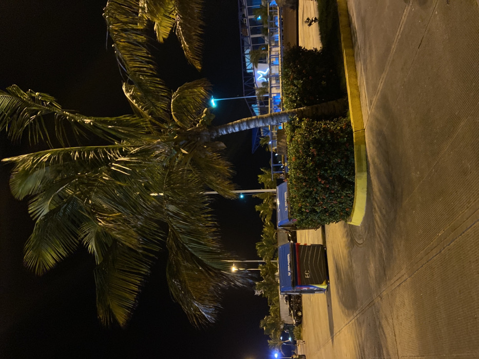 A palm tree stands tall at night, its fronds casting shadows. Nearby, a building with blue accents is visible, while shrubs line a pathway. Several blue dumpsters and trucks are parked along the curb. The scene is lit by streetlights. A yellow painted curb is also a component of the composition.
