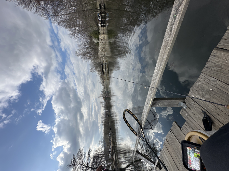 The scene depicts an outdoor fishing environment in Samoranovo, Bulgaria. The perspective is from a wooden pier or dock overlooking a calm body of water, likely a lake or pond, under a partially cloudy blue sky. In the immediate foreground, a person's leg, clad in dark pants, is visible at the bottom left. Beside them, a black, open tackle box containing various fishing lures and gear rests on the wooden planks of the pier, next to a beige bucket. A fishing rod, dark in color, extends from the left, resting horizontally on a weathered wooden railing before angling into the water. A black-rimmed fishing net with mesh netting is propped vertically against the same railing. The calm water surface prominently reflects the overhead clouds and surrounding trees. Along the left shoreline, a line of bare deciduous trees stands above a path or road where several parked vehicles are visible. Further in the background on the left, indistinct structures are present. The right shoreline features a denser concentration of bare deciduous trees, with a prominent stone wall or structure along the bank. Further along this bank, multiple small wooden docks or platforms extend into the water, with what appear to be boats or floating structures moored. The sky is bright blue with scattered large, white and grey cumulus clouds.