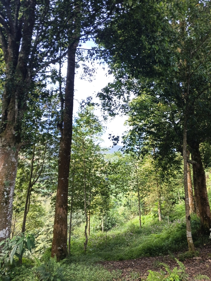 A verdant forest scene displays a variety of trees, their trunks ranging from thick and aged to slender and young. Lush green foliage fills the frame, with glimpses of a bright sky peeking through the canopy above. The ground is carpeted in greenery, sloping upwards to suggest a hillside setting. The overall impression is one of serene natural beauty.