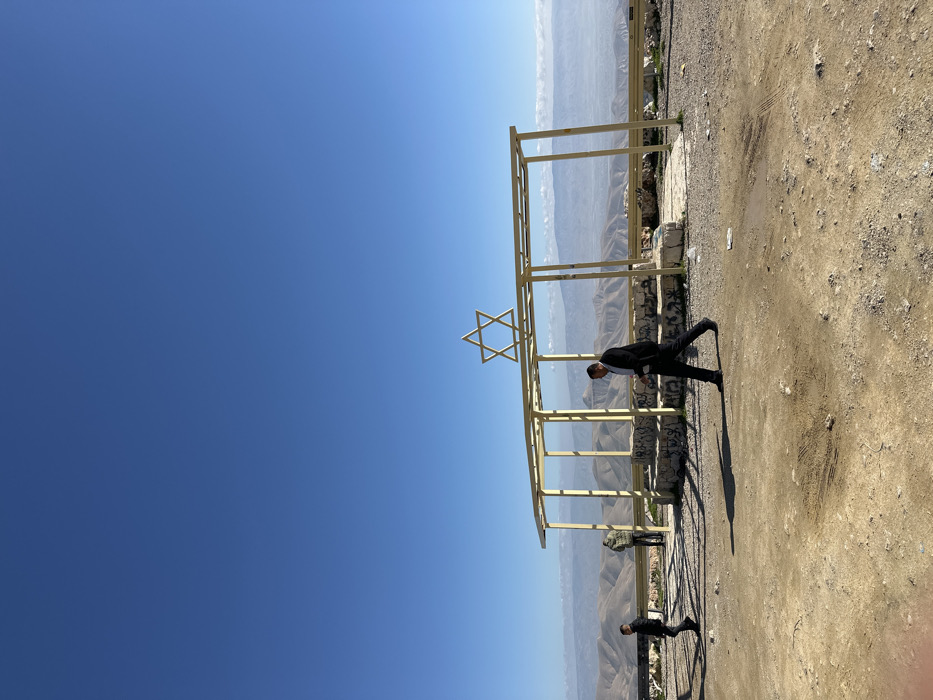 The scene depicts an elevated outdoor location under a clear blue sky, in the city of Unknown, Palestinian Territory. A light-colored, open-sided metal structure, possibly a gazebo or canopy, featuring a large Star of David symbol at its peak, stands on a stone base with visible graffiti. Three individuals are present: a man in a dark suit walks from right to left across the foreground's dirt path; a second person in dark attire walks from left to right further back; and a third person in a camouflage jacket stands behind the structure, facing the distant arid mountains. The immediate ground is uneven, light brown earth. The background reveals multiple layers of dry, light brown hills and mountains extending to the horizon.