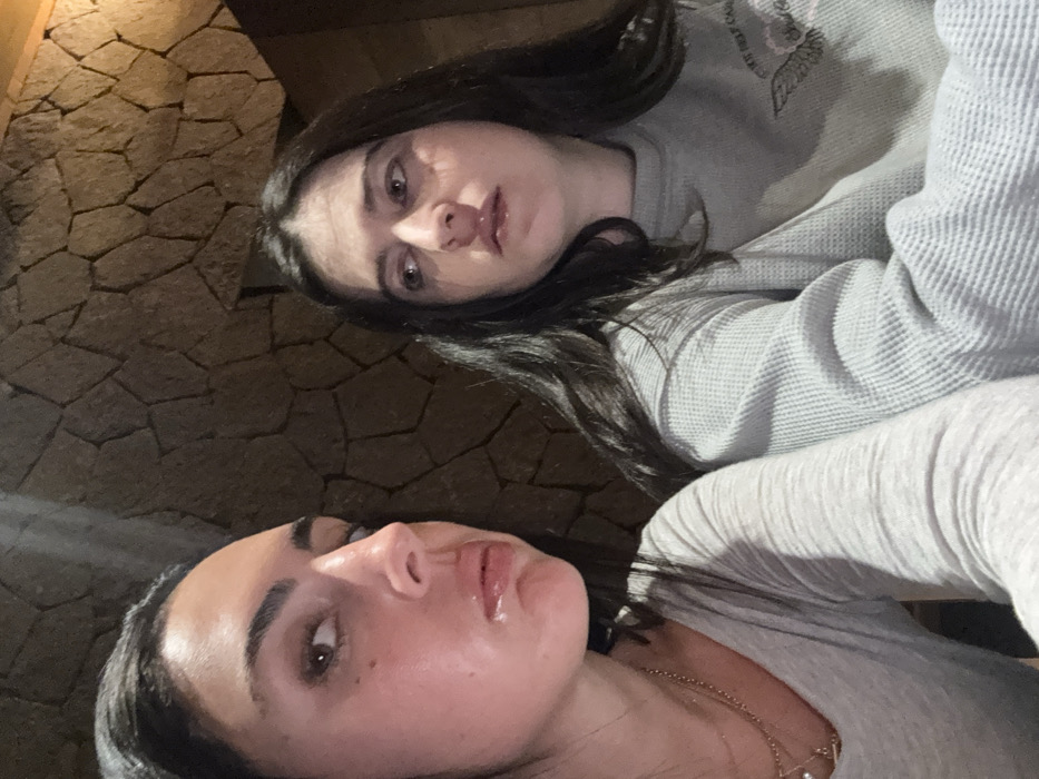 Two females are depicted in a dimly lit scene against a background of a dark, irregularly-shaped stone wall. The location is Avandaro, Mexico. The individual on the left has dark hair, styled back from her face, with brown eyes and dark eyebrows. She is looking directly at the camera, with her head slightly angled. Her left cheek and lips exhibit a reflective sheen. She is wearing a light grey V-neck top, and a thin, multi-strand, gold-colored necklace is visible. The individual on the right has long, dark, loose hair, brown eyes, and dark eyebrows. She is looking to her left, away from the camera. Her lips also display a reflective sheen. She is wearing a light grey, long-sleeved, waffle-knit shirt with an embroidered winged design visible on the upper left chest. Both individuals are in close proximity, filling the majority of the frame. The ambient lighting is low, suggesting an indoor or sheltered environment.