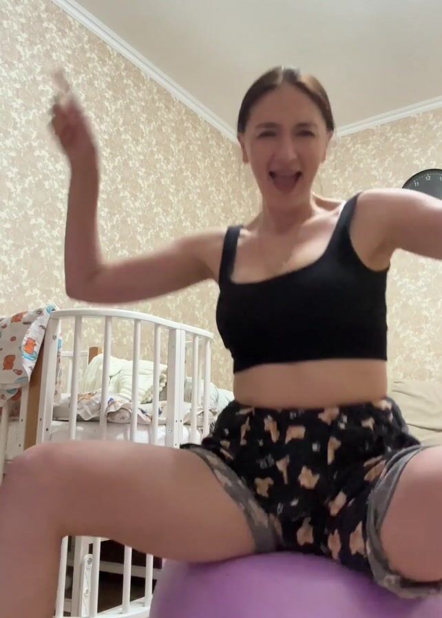 A woman with medium-length brown hair pulled back in a ponytail is seated on a large, purple exercise ball. She is wearing a black sports bra and patterned shorts. She is gesticulating with her hands and singing, lip-syncing to music playing in the background. Behind her is a white baby crib with bedding visible inside. The wallpaper is patterned and a clock is mounted on the wall.