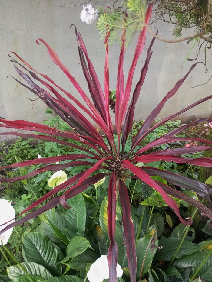 This image depicts a close-up, static scene of cultivated flora in Ciherang, Indonesia. The central subject is a robust plant with numerous long, lanceolate leaves radiating outwards from a central stalk. These leaves exhibit a predominant deep red to maroon coloration, with some displaying darker tips and a slight undulating form. Below and surrounding the central plant, a dense arrangement of other green foliage is present. Notably, several Peace Lily (Spathiphyllum) plants are identifiable by their broad, heavily ribbed green leaves and distinct white, spathe-like inflorescences. Other smaller, varied green plant species are interspersed throughout the lower half of the frame. The background consists of a light grey, uniformly textured wall, likely concrete or stucco, occupying the upper portion of the image. In the upper right quadrant, a branch with fine, needle-like green foliage extends into the frame, partially obscuring the background wall. A small cluster of white floral structures is also visible against the wall in the upper center-right. No human subjects are present, and no discernible actions or specific interactions are occurring beyond the static arrangement of plant life. The lighting is diffused, resulting in soft shadows.