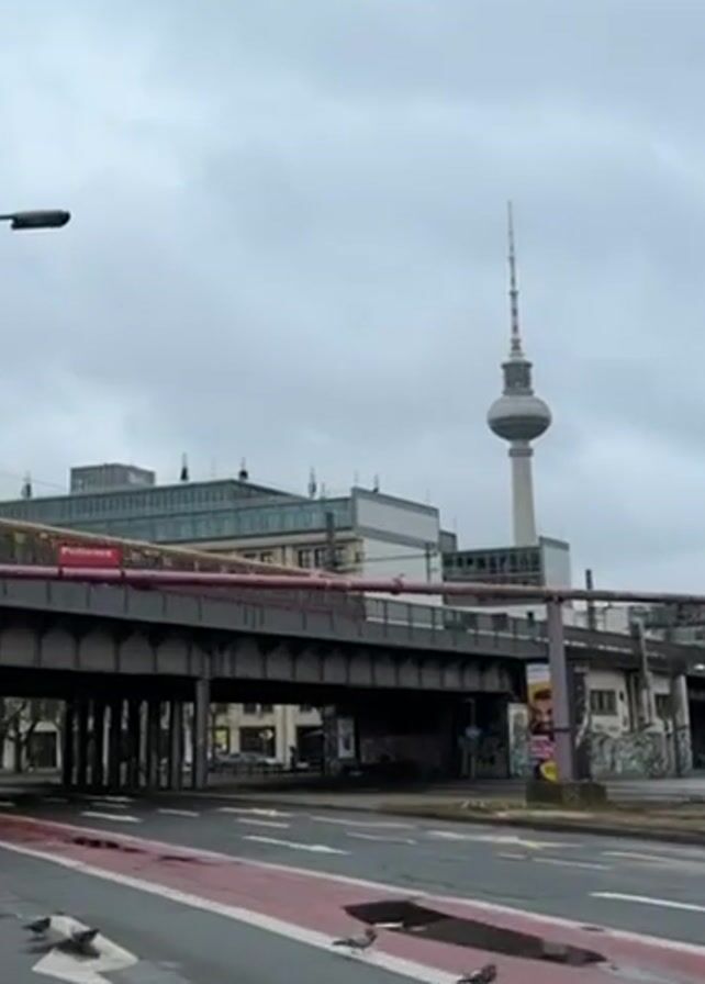 The camera captures a street scene in Berlin, Germany. In the background, the iconic Berlin TV Tower (Fernsehturm) rises tall. A bridge carrying the elevated train tracks dominates the midground. A bright yellow train is visible on the tracks. The foreground shows an asphalt road with white arrow lane markings and a red bike lane. Several pigeons are scattered on the road surface. The sky is overcast, contributing to a muted color palette overall. The day seems to be cloudy and grey. There is graffiti in some areas.
