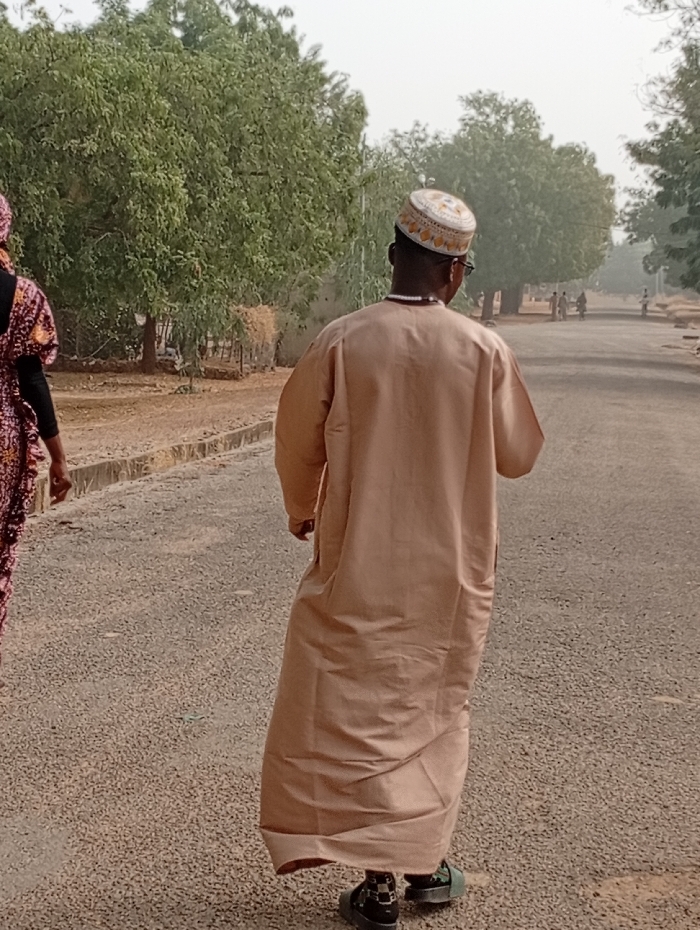 A man wearing a tan-colored robe and a small white cap walks away on an asphalt road. Trees and low vegetation are visible on both sides. Another individual in a colorful dress walks near the man. Additional people walk in the distance. The sky is overcast.
