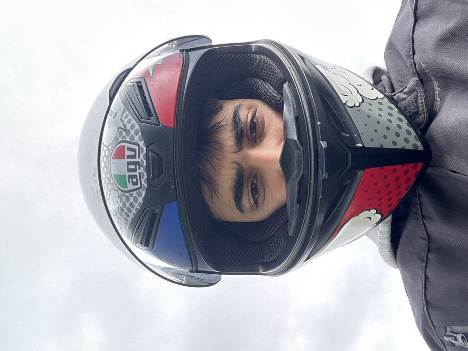 - "A low-angle, close-up image depicts an individual wearing a motorcycle helmet and protective gear against an overcast sky" by FM-izaur1, licensed under CC BY 4.0